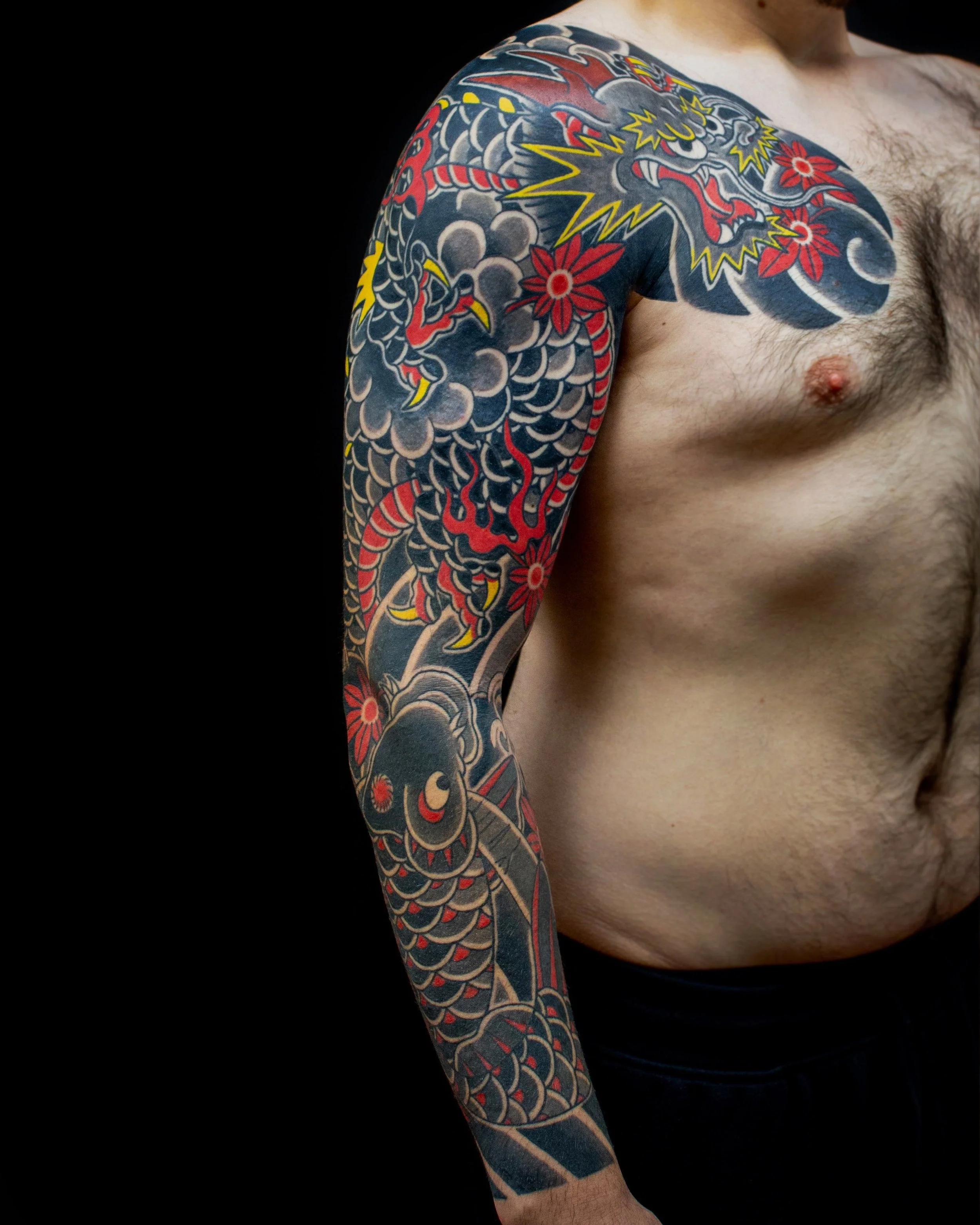 Koi and Dragon full sleeve with chest plate. Done by Horiyama